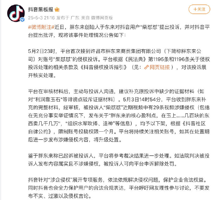5月3日,@抖音黑板报 发文称,近日,胖东来创始人于东来对抖音用户“柴怼怼”提出投诉,并对抖音平台提出批评,现将该事件处理情况公告如下: