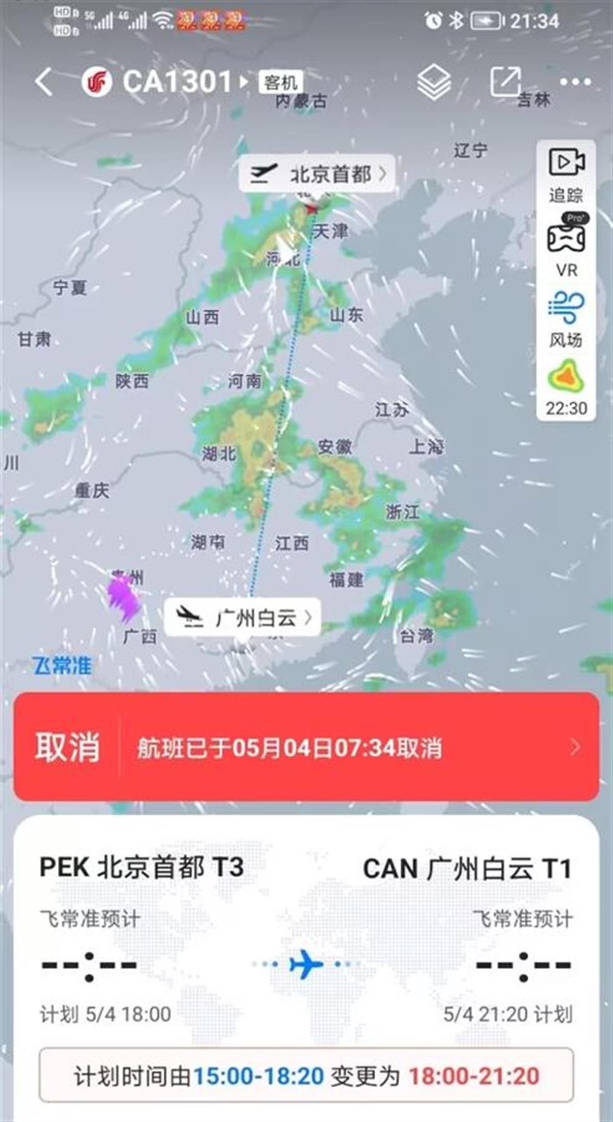 因为冰雹雷雨天气,广州白云机场航班大面积受到影响。极目新闻记者登录飞常准APP发现,大量白云机场的起降航班出现延误,甚至取消。5月4日北京到广州的海航HU7807次航班原定于中午12时30分起飞,16时05分到达;最终是12时53分起飞,16时48分备降桂林两江机场,18时11分再次起飞,19时07分才抵达广州白云机场,延误了三个小时。同样是5月4日北京到广州的国航CA1301次航班则已取消,国航客服人员告诉记者,取消是因为天气原因。