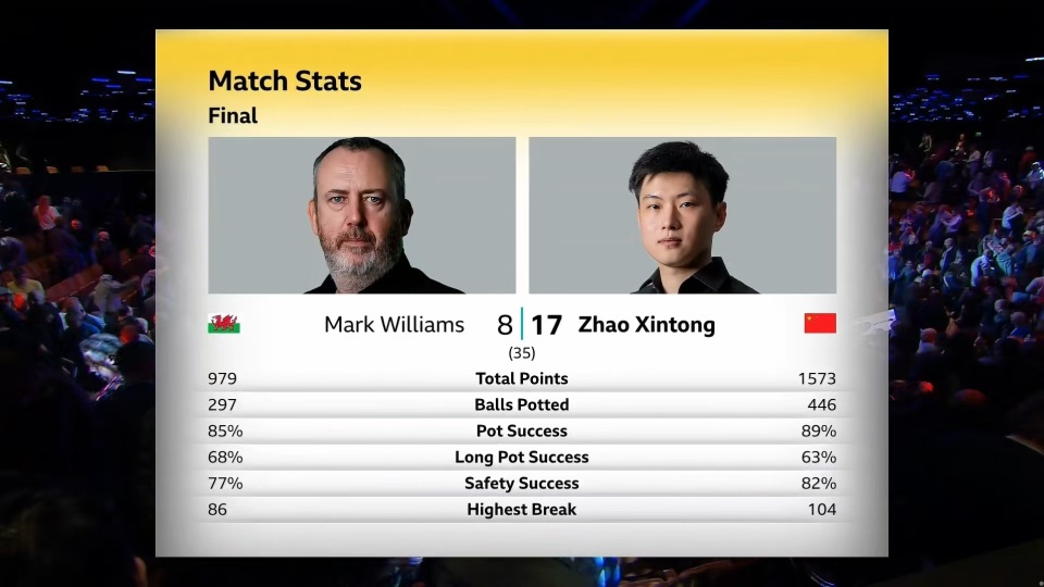 在最后一阶段的比赛,威廉姆斯手感火热,连扳四局。在第30局,赵心童抓住对手的一次失误,一鼓作气地拿下了比赛,最终以总比分18:12夺得了本次斯诺克世锦赛的冠军。