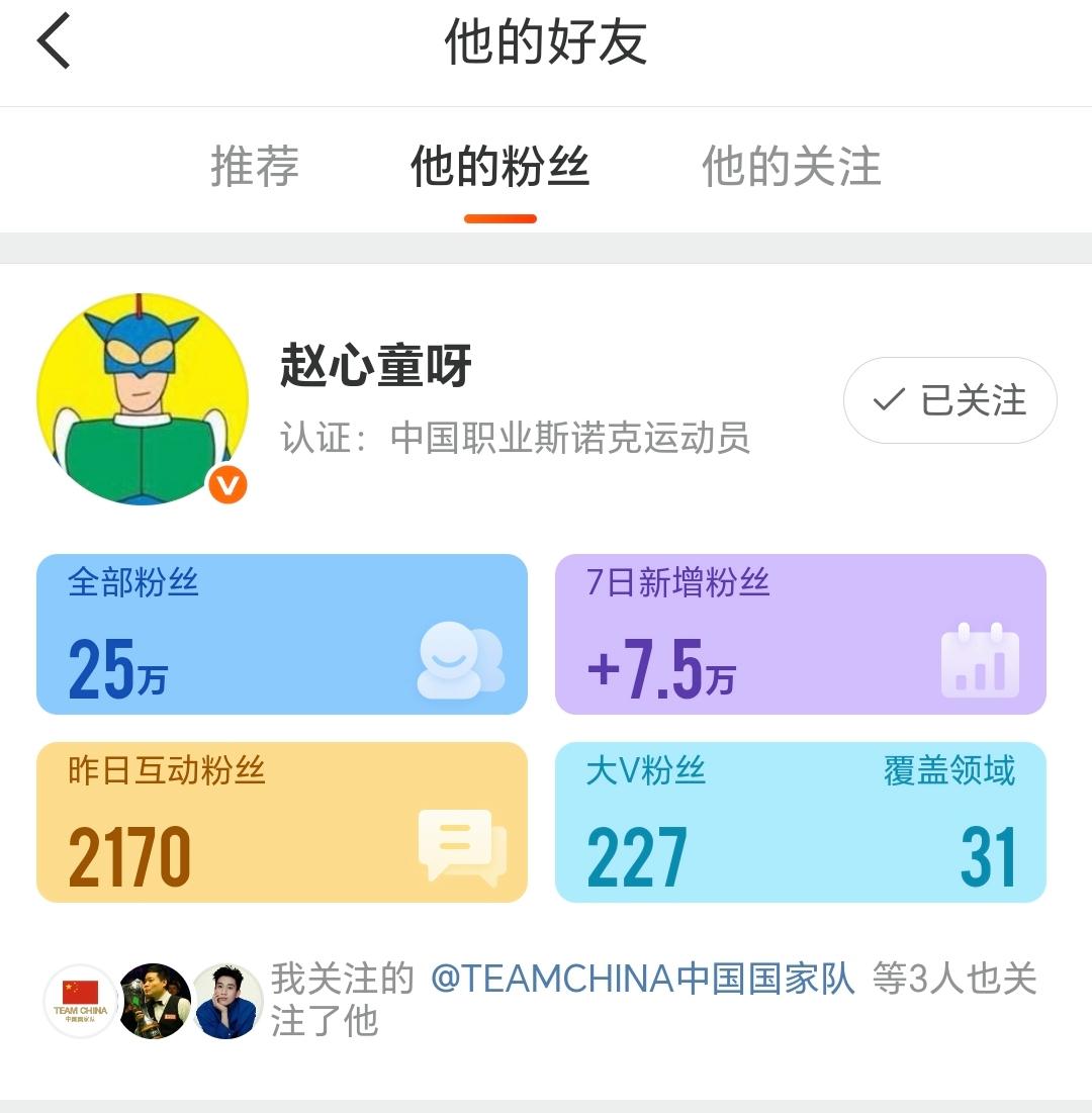 5月6日,赵心童的个人微博账号“赵心童呀”在夺冠后发布了“坚持初心”的微博。当天上午11点左右,大皖新闻记者注意到,赵心童的微博共有25万粉丝,平台数据显示,该账号7日新增粉丝数为“+7.5万”。7日新增的大V粉丝包括演员王子奇,其微博粉丝超过800万。微博“王子奇是演员王子奇”5月6日凌晨3点多钟发文,“祝贺好兄弟赵心童夺得2025斯诺克世界锦标赛冠军”,并@了赵心童的个人微博。王子奇该条微博还包括一个抽奖活动,其中参与抽奖的要求之一就是关注赵心童的微博账号。