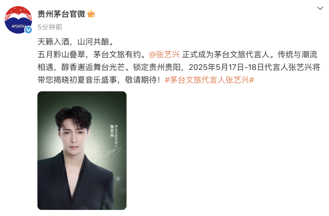 5月7日,贵州茅台官方号宣布:“张艺兴正式成为茅台文旅代言人,传统与潮流相遇,醇香邂逅舞台光芒”。