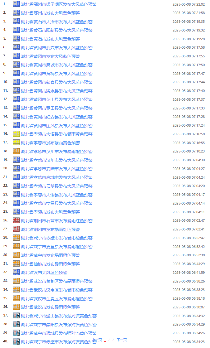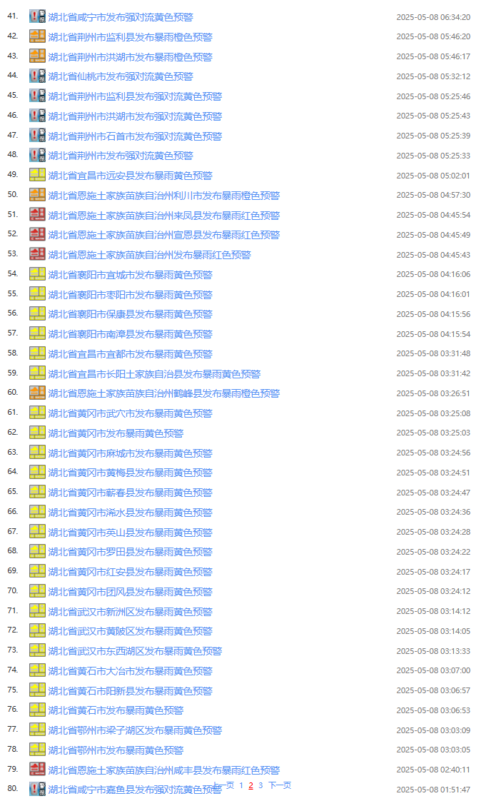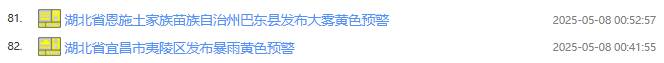 今日(5月8日)凌晨起,湖北武汉、宜昌、黄冈、恩施等地发布暴雨预警,咸宁、荆州等地发布强对流黄色预警,天门、潜江、仙桃等地将出现6到7级阵风,其中,荆州东部、仙桃、武汉南部、鄂州、黄冈、黄石、咸宁局地可达8级大风。截至今日7点30分,湖北已经发布82条预警信息。