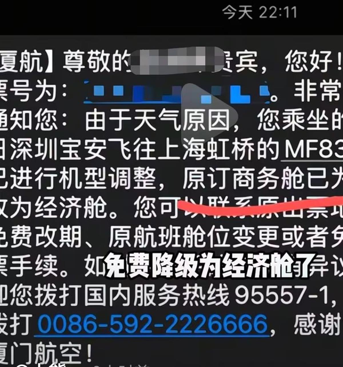 近日,有博主发视频称,5月6日,他乘坐厦门航空从深圳宝安飞往上海虹桥的MF8318航班时,遭遇了“免费降舱”的情况,即从商务舱降等到经济舱。他选择取消值机,并改签到次日航班的商务舱,在机场的安排下入住了酒店。视频引发网友广泛关注。