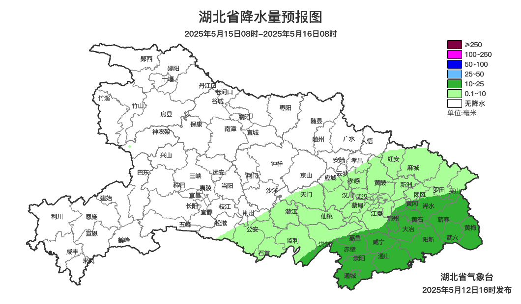 5月15日08时-16日08时,鄂东南小到中雨转阴天;鄂东北东部、江汉平原东部小雨转阴天;其他地区多云。最高气温鄂西北28~31℃、其他地区24~28℃,最低气温17~22℃,偏北风2到3级。