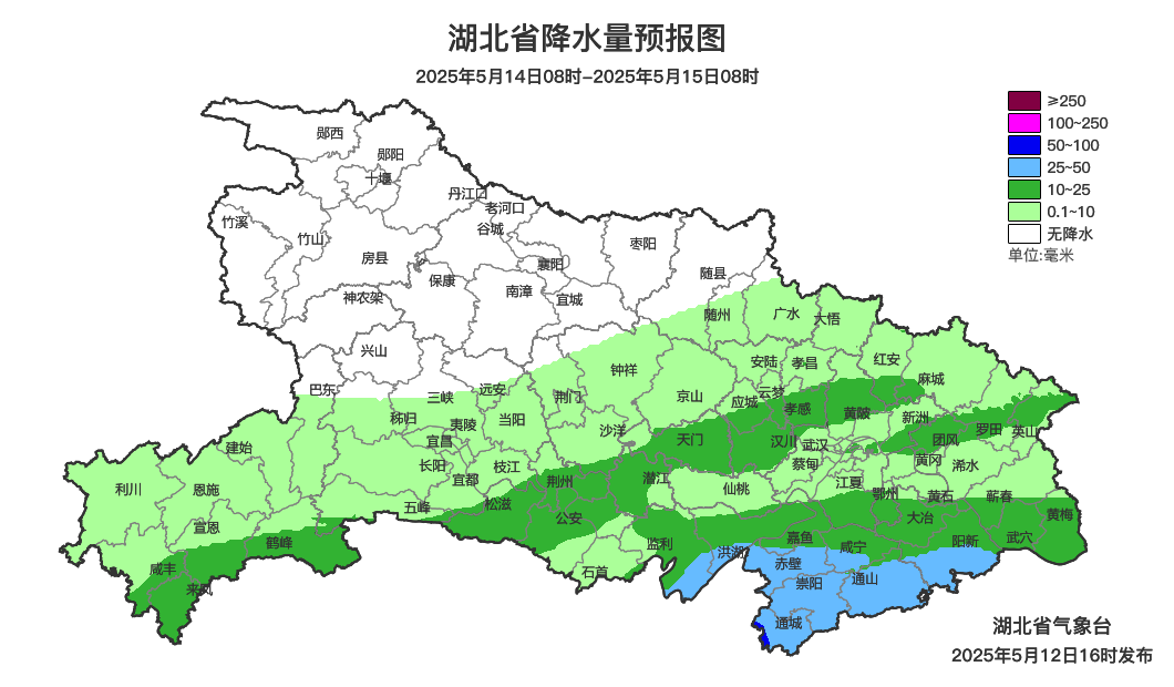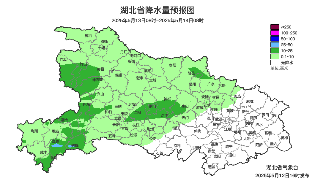 5月13日08时-14日08时,鄂西北、鄂西南、江汉平原、鄂东北西部多云转小到中雨,其中鄂西南局地大雨,部分地区伴有雷电;其他地区晴天转多云。最高气温西部25~30℃、中东部30~34℃,最低气温16~21℃,偏南风3到4级、阵风5到6级。