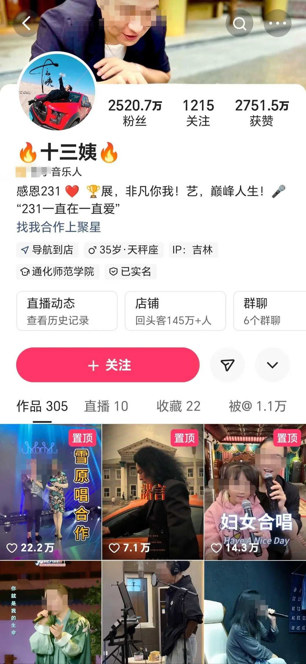 “十三姨”原名郝某,在某短视频平台上有着2520万的粉丝,账号定位是音乐人,账号主要是发布唱歌视频,也开直播带货。