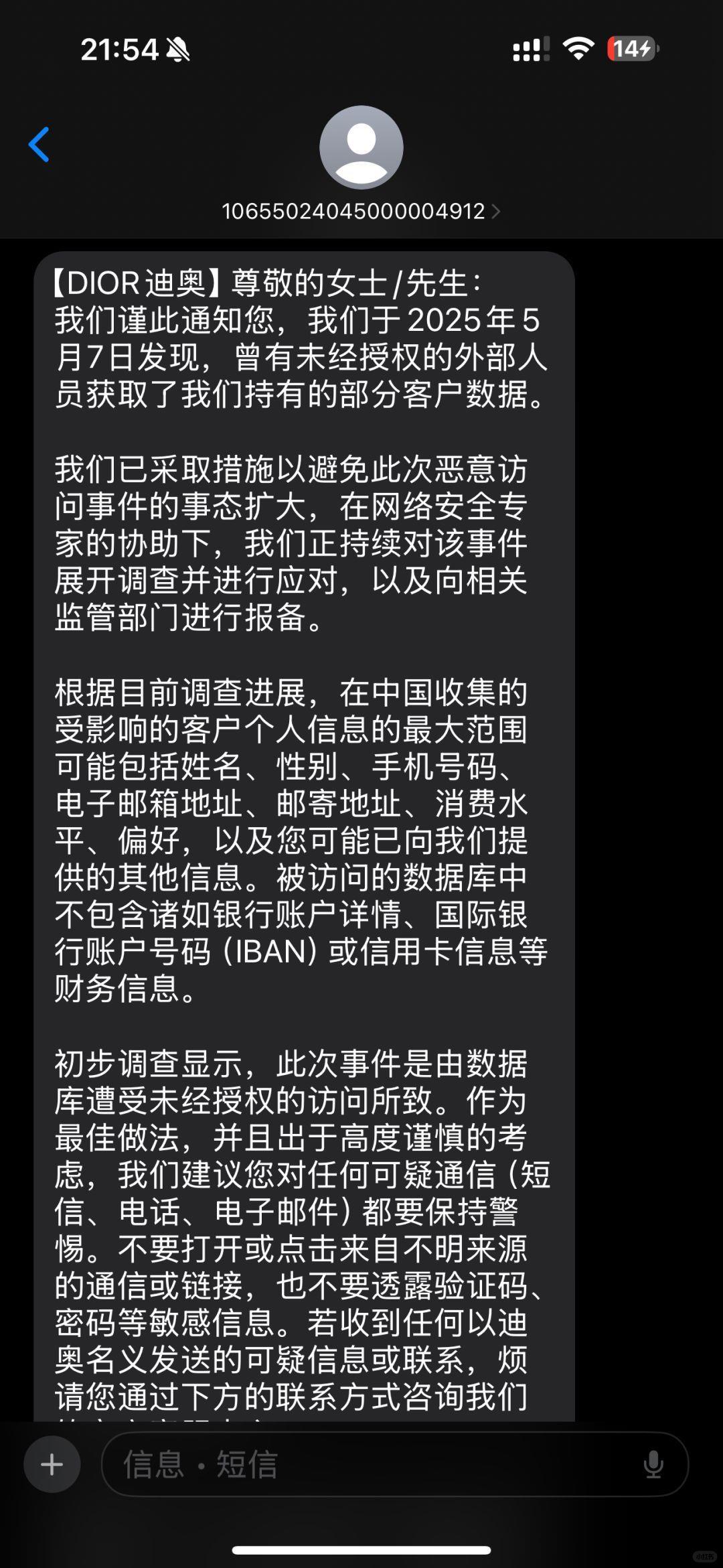 短信显示,迪奥方面5月7日发现,有未经授权的外部人员获取了持有的部分客户数据,客户的姓名、手机号码、邮寄地址等可能因此受影响。相关短信中称,被访问的数据库中不包含诸如银行账户详情、国际银行账户号码(IBAN)或信用卡信息等财务信息。迪奥方面建议用户对任何可疑通信(短信、电话、电子邮件)都要保持警惕,不要打开或点击来自不明来源的通信或链接,也不要透露验证码、密码等敏感信息。