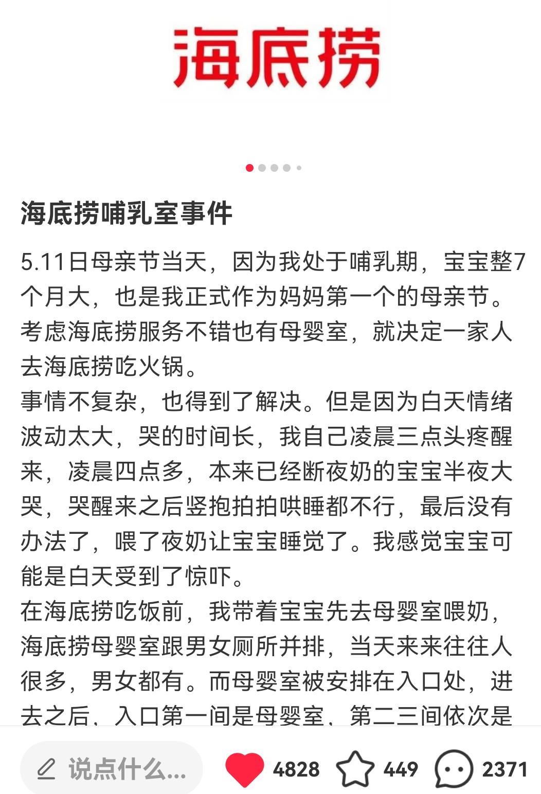 近日,天津市民寒女士(化姓)在网络发文称,她在海底捞吃饭期间,到母婴室哺乳,其间被餐厅员工多次打开哺乳室的门打扰,其中还包括一名男性服务员,寒女士希望海底捞公开道歉。5月14日,海底捞官方回应”高度重视,并已向顾客表达真诚歉意,力求最大程度弥补”。