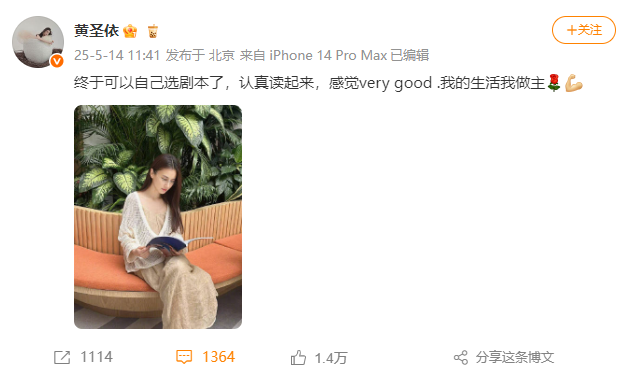 5月14日,黄圣依发文:终于可以自己选剧本了,认真读起来,感觉very good .我的生活我做主。