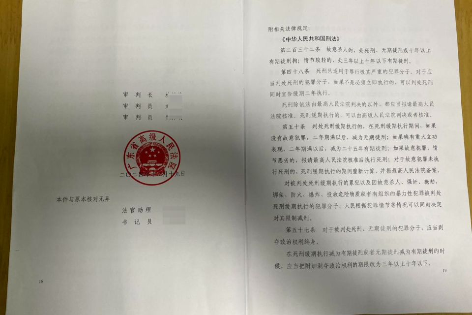 2025年5月16日,应东莞市中级人民法院(下简称东莞市中院)通知,刘宝美及郑丽敏的家人前往该院领取广东省高级人民法院(下简称广东省高院)出具的《刑事附带民事判决书》(下简称《二审判决书》)。