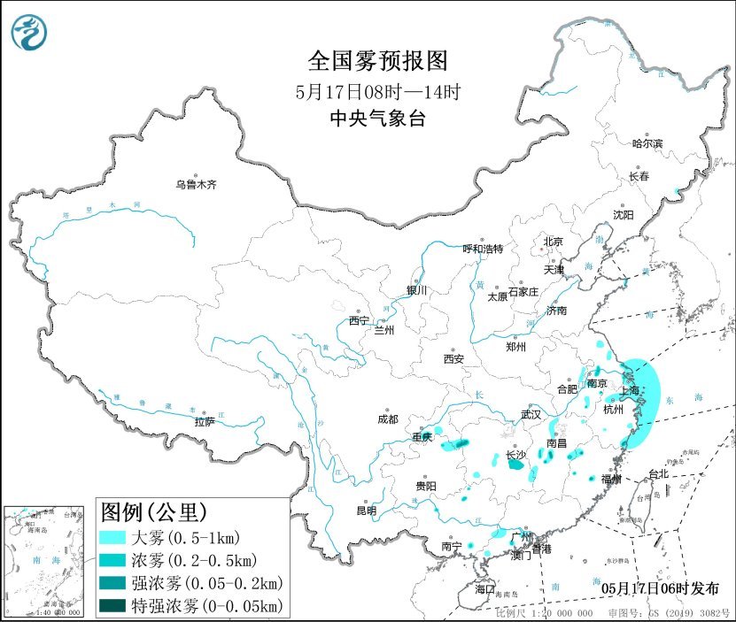 预计,17日早上至中午,东海西部海域、江苏东部沿岸海域、浙江沿岸海域、长江口及杭州湾附近海域、舟山群岛附近海域、上海港、宁波港将有能见度不足1公里的大雾。此外,山东东部、江苏中南部、浙江北部和东部、安徽东南部、江西中北部、湖南中部、贵州北部、重庆南部等地的部分地区有大雾,局地有能见度不足200米强浓雾。