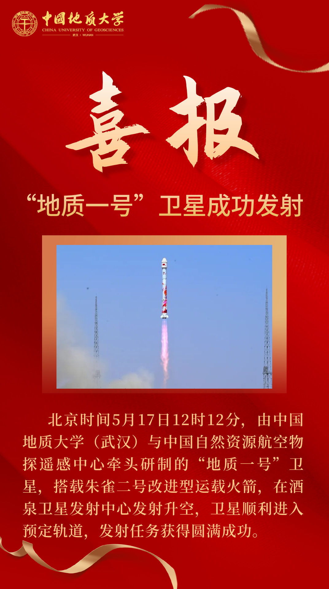 5月17日,“地质一号”卫星于酒泉卫星发射中心成功发射。该卫星是我国第一颗服务地质行业的高光谱遥感小卫星,将极大提升我国在资源勘查、矿产监测和自然资源调查监测等领域的自主遥感能力,标志着我国在地质勘查和监测高光谱遥感卫星“小型化、智能化、专业化”发展道路上实现了重大突破。