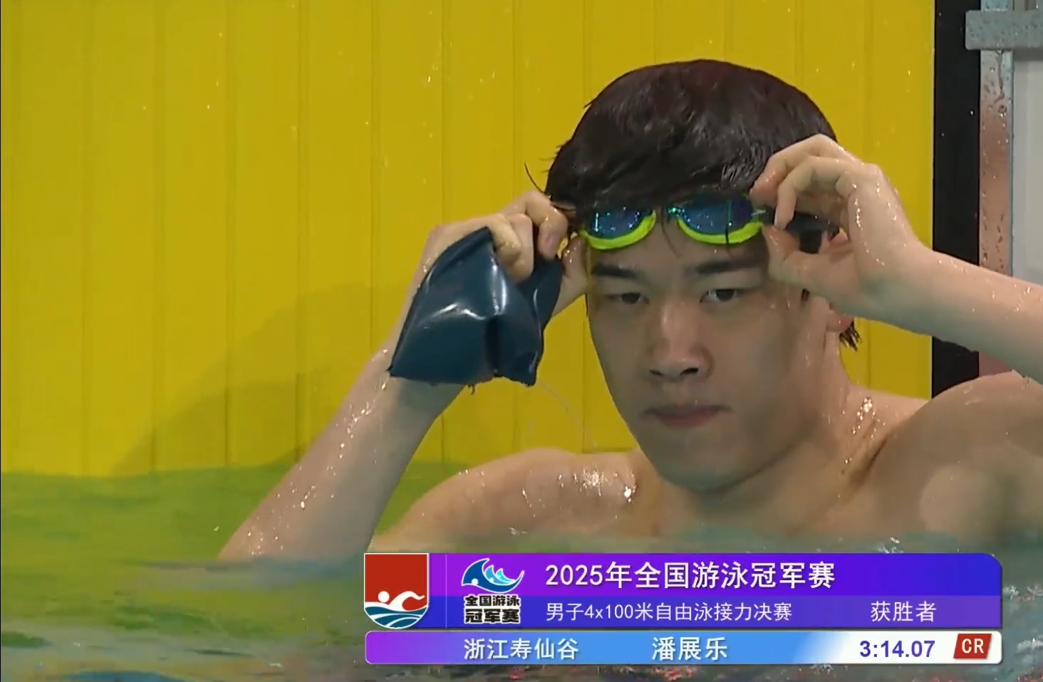 全国游泳冠军赛男子4×100米接力决赛,浙江寿仙谷派出何峻毅、沈加豪、洪金权、潘展乐出战,凭借着潘展乐最后一棒的反超获得冠军,成绩3分14秒07刷新赛会纪录,潘展乐再收获一枚金牌。