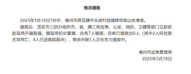 接报后,茂名市三防办组织市、县、镇三级应急、公安、消防、卫健等部门立即赶赴现场开展救援。据现场初步掌握,共有7人被困,目前已搜救出6人(其中2人经抢救无效死亡、4人已送医院救治),剩余失联1人正在全力搜救中。