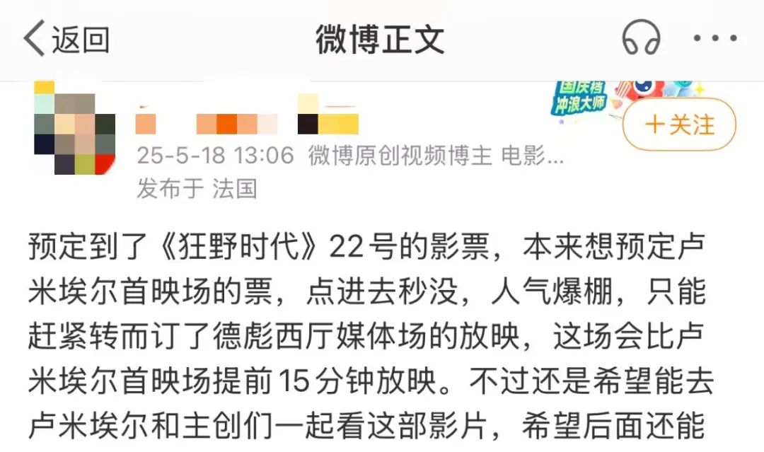 极目新闻记者注意到,多位在戛纳的影评人、媒体人表示,易烊千玺《狂野时代》的这个首映场在开票后“秒没”,根本抢不到票,可见这部“华语独苗”电影的人气之高。