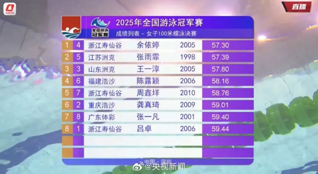 5月18日晚,2025年全国游泳冠军赛女子100米蝶泳决赛中,余依婷以57秒30的成绩,夺得冠军;张雨霏以57秒39的成绩,收获亚军;王一淳游出57秒80,获得季军。