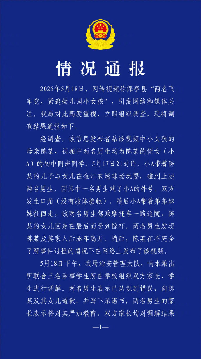 经调查,该信息发布者系该视频中小女孩的母亲陈某,视频中两名男生均为陈某的侄女(小A)的初中同班同学。5月17日21时许,小A带着陈某的儿子与女儿在金江农场球场玩耍,碰到上述两名男生,因其中一名男生喊了小A的外号,双方发生口角(没有肢体接触)。随后小A带着弟弟妹妹往回走,该两名男生驾乘摩托车一路追随,陈某的女儿因走在最后而受到惊吓。两名男生发现陈某及其家人后驱车离开。随后,陈某在不完全了解事件过程的情况下在网络上发布了该视频。