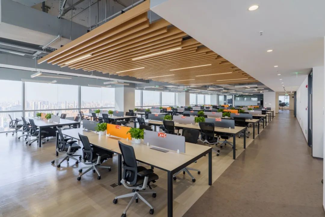 塔楼幕墙设有通风器促进室内外空气交换,过渡季节可减少90%以上空调使用,节约能耗的同时也让新鲜空气流通进楼;办公区照明采用“T”型灯分回路控制,实现能效、可靠性与管理效率的综合提升,应对不同工作场景需求;桌面智能终端集成灯光、空调温度控制,员工可通过钉钉“码上行政”系统一键调整照明和空调温度,实现人性化的办公环境。