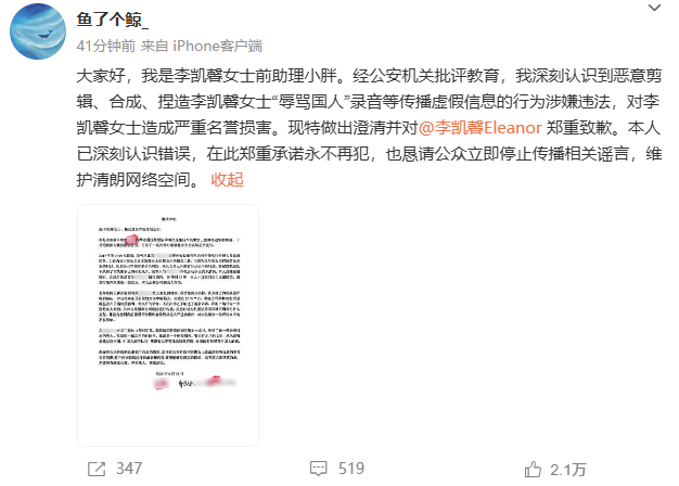 21日,李凯馨前助理@鱼了个鲸_发布澄清声明,表示李凯馨“辱骂国人”录音是自己恶意剪辑、合成、捏造,“现特做出澄清并对李凯馨郑重致歉,本人已深刻认识错误,在此郑重承诺永不再犯”。