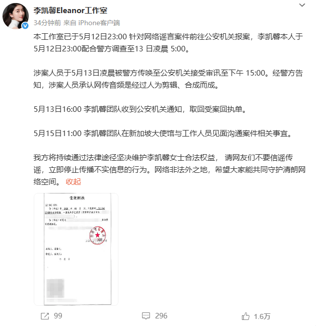 随后,李凯馨工作室公布报案过程:本工作室已于5月12日23:00 针对网络谣言案件前往公安机关报案,李凯馨本人于5月12日23:00配合警方调查至13日凌晨 5:00。涉案人员于5月13日凌晨被警方传唤至公安机关接受审讯至下午 15:00。经警方告知,涉案人员承认网传音频是经过人为剪辑、合成而成。5月13日16:00 李凯馨团队收到公安机关通知,取回受案回执单。5月15日11:00 李凯馨团队在新加坡大使馆与工作人员见面沟通案件相关事宜。我方将持续通过法律途径坚决维护李凯馨女士合法权益, 请网友们不要信谣传谣,立即停止传播不实信息的行为。网络非法外之地,希望大家能共同守护清朗网络空间。