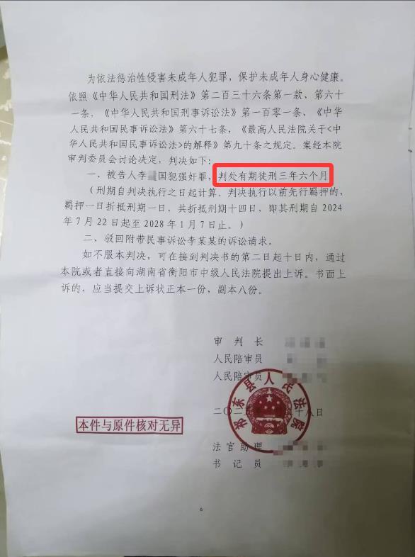 2025年3月,祁东县人民法院判处李某国强奸罪,获有期徒刑三年六个月,驳回附带民事诉讼请求。“李某国一分钱都没赔”,李大仁说。