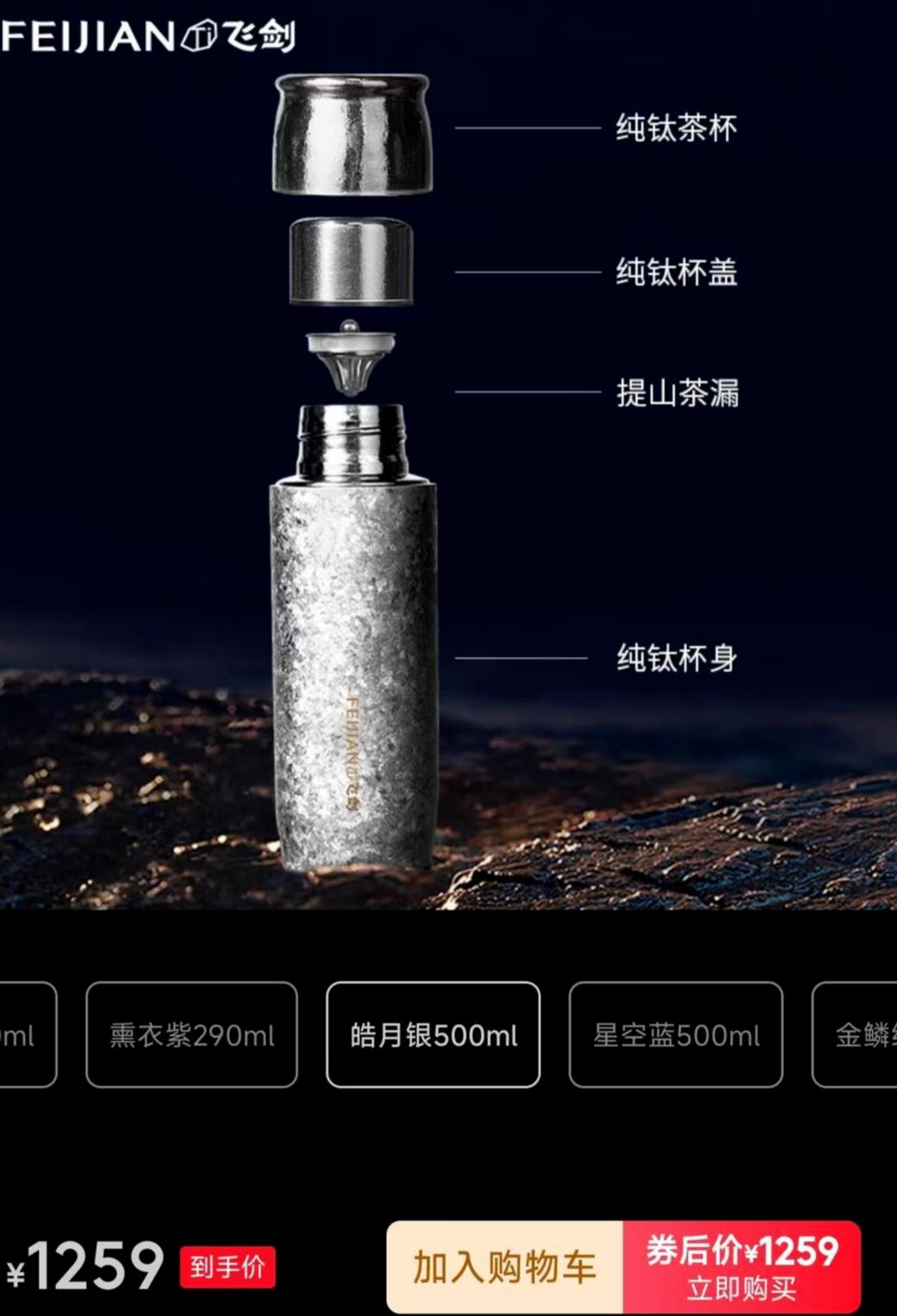 红星资本局注意到,在天猫热销的某款飞剑牌纯钛保温杯容量从290毫升到500毫升不等,价格在1076.82元-1255.82元区间分布。目前,该链接显示已售超过一万单。淘宝飞剑旗舰店的一名客服告诉红星资本局,飞剑钛杯使用纯度高达99.8%的钛金属作原料,加上飞剑核心“晶钻科技”技术处理,造就了独特的抑菌保鲜机制。