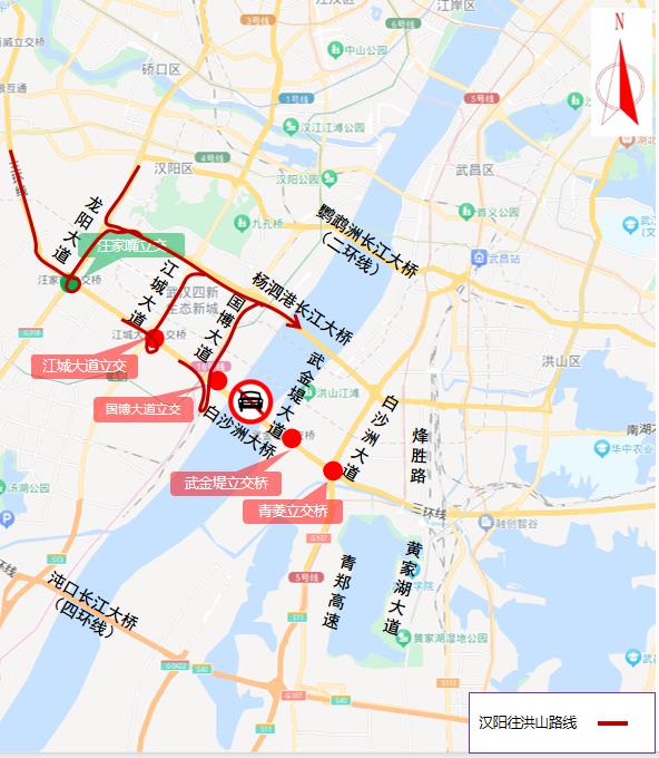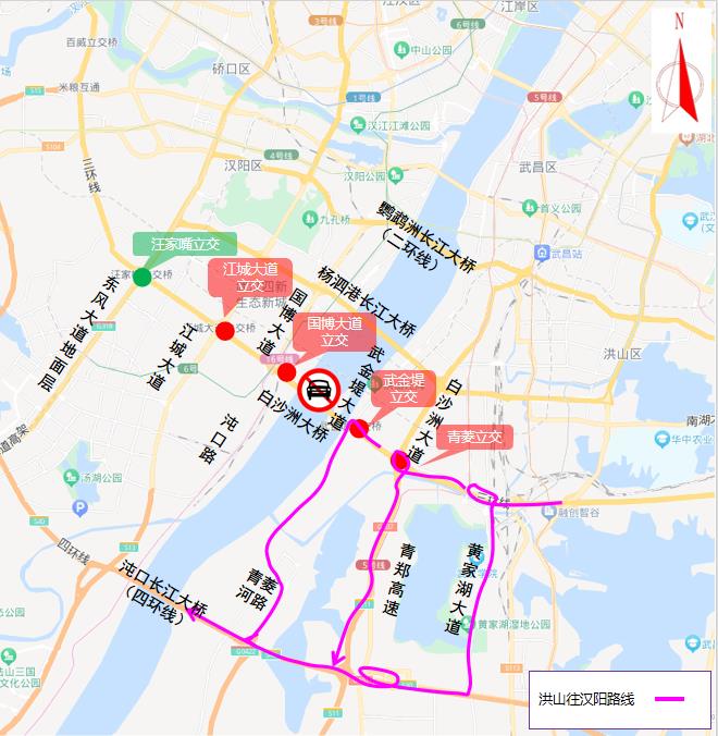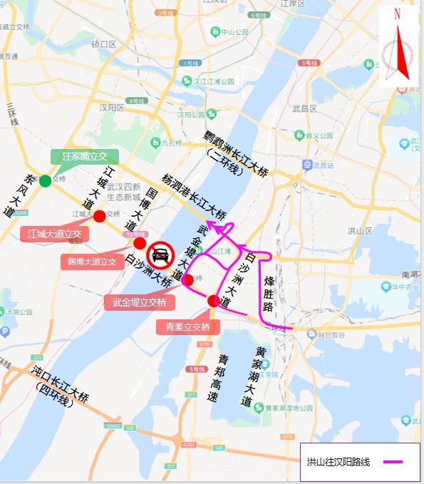 (一)由洪山往汉阳方向需通行白沙洲长江大桥的车辆,可通过武金堤立交绕行武金堤大道,或通过青菱立交绕行白沙洲大道,或提前绕行烽胜路等周边道路通行杨泗港长江大桥。