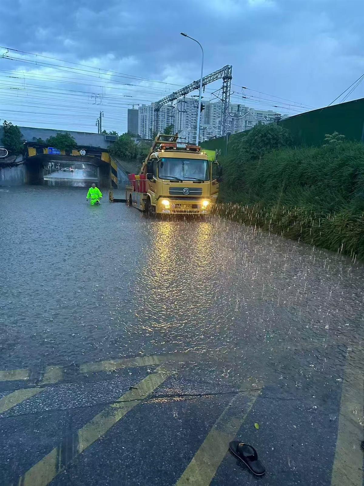 5月22日凌晨3时左右,武汉市出现暴雨并伴有雷电,雨势迅猛,慈惠街临空港大道涵洞很快出现了积水,最深处达1.1米,如不及时排渍水,将会导致车辆通行受阻,行人也难以通行。