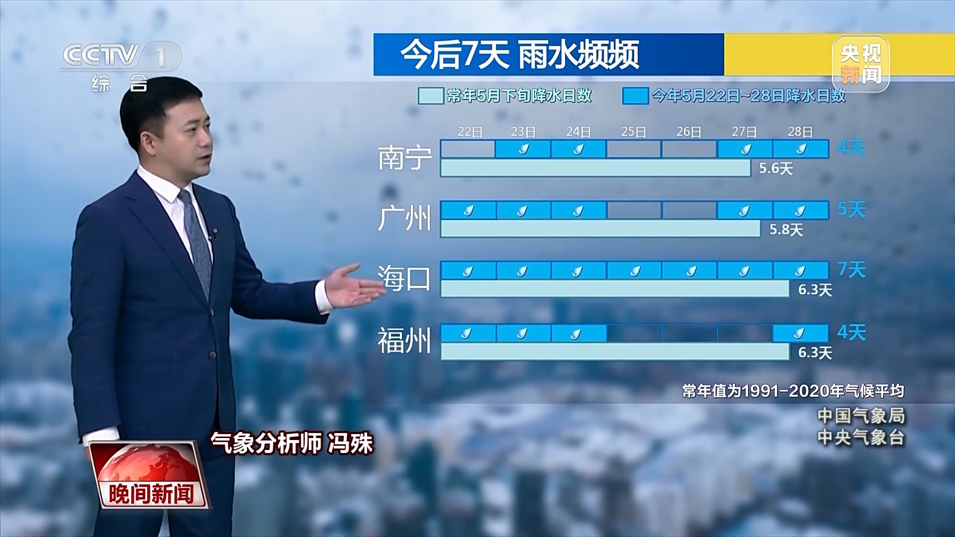 而今后的7天江南华南降雨也会十分的频繁,特别是华南一带,一些城市的雨日会比常年整个5月下旬还要多。要及时关注预警信号,做好暴雨防范的准备。