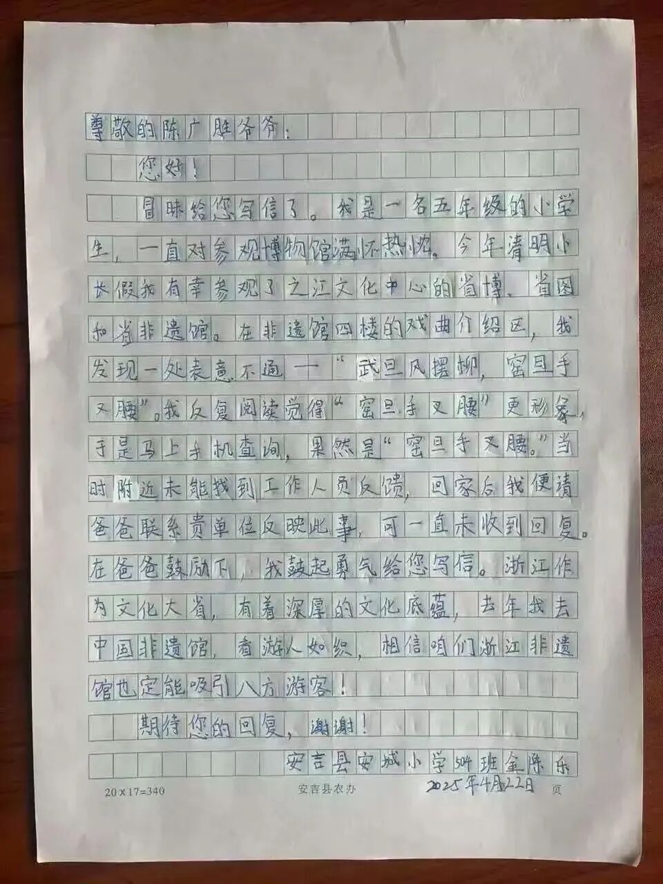 4月22日,浙江安吉县安城小学的金陈乐小朋友在父亲鼓励下给陈广胜写信,反映在浙江省非物质文化遗产馆参观时,发现戏曲介绍区“武旦风摆柳,窑旦手又腰”的介绍不通,应为“手叉腰”。