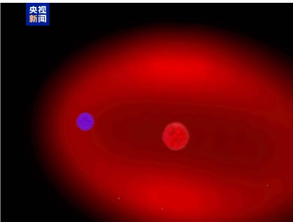 △共包层演化模拟,蓝色天体为中子星,红色天体为膨胀的巨星。
