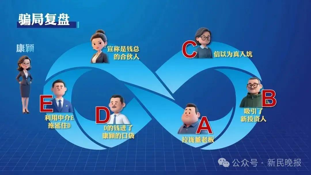 这个莫比乌斯环,形象地呈现了康颖的骗局。被害人依次关联,从拉人入局成立公司、到吸引新投资人,资金不断流入康颖手中,再通过中介拖延掩盖真相。环环相扣,形成循环诈骗的闭合回路,层层设套、持续敛财。