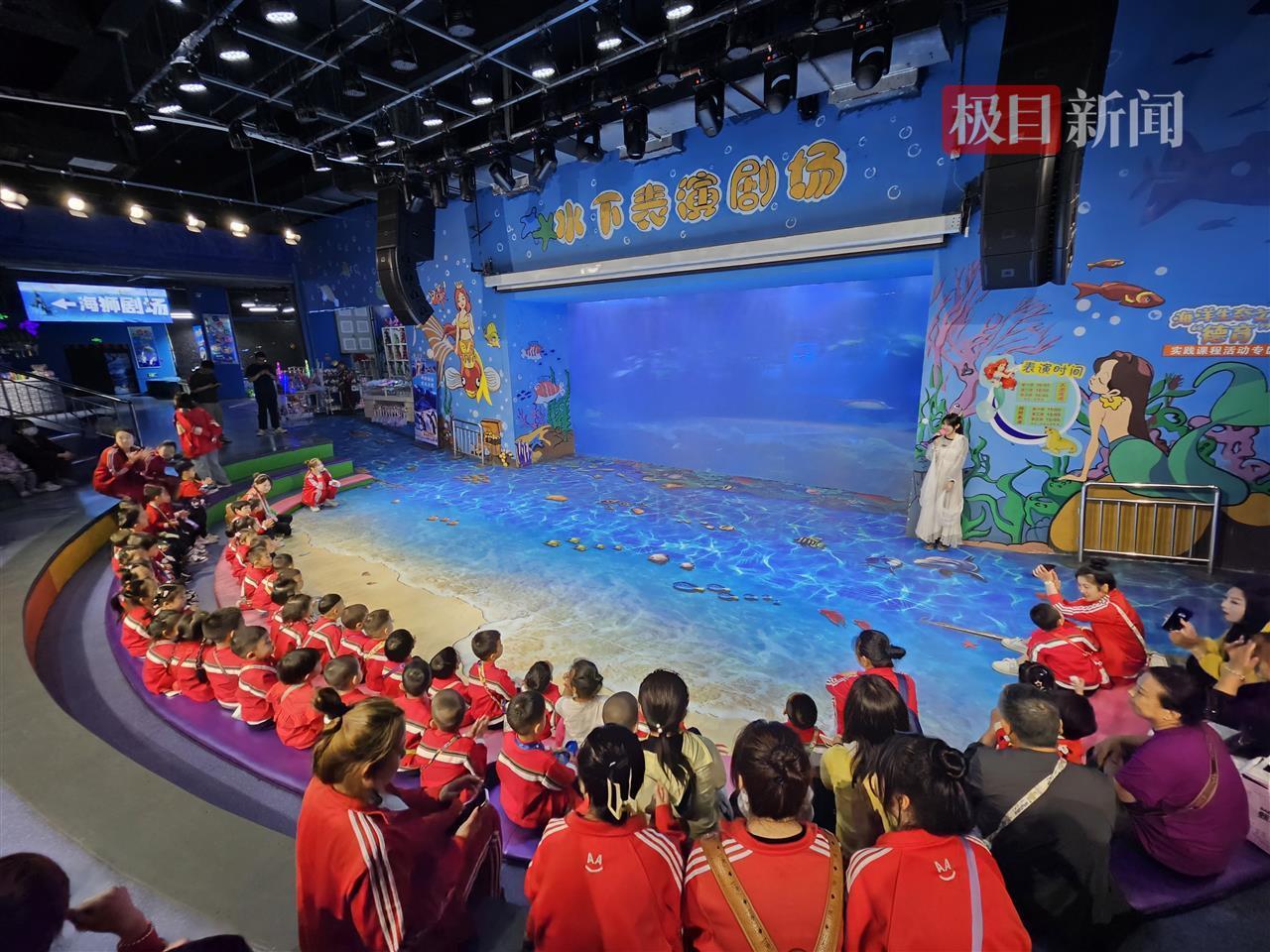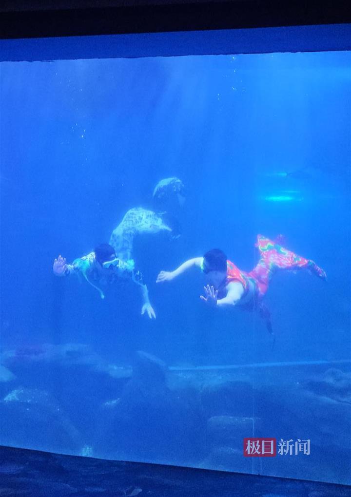 记者注意到,穿着大花鱼尾服的男子配合同伴在水中翻滚游动,其间还上演了哪吒大闹胖头鱼的剧情,灵活搞怪的动作引得师生连连鼓掌,现场一片欢声笑语。十多分钟后,剧场玻璃幕墙内演职人员结束了表演。