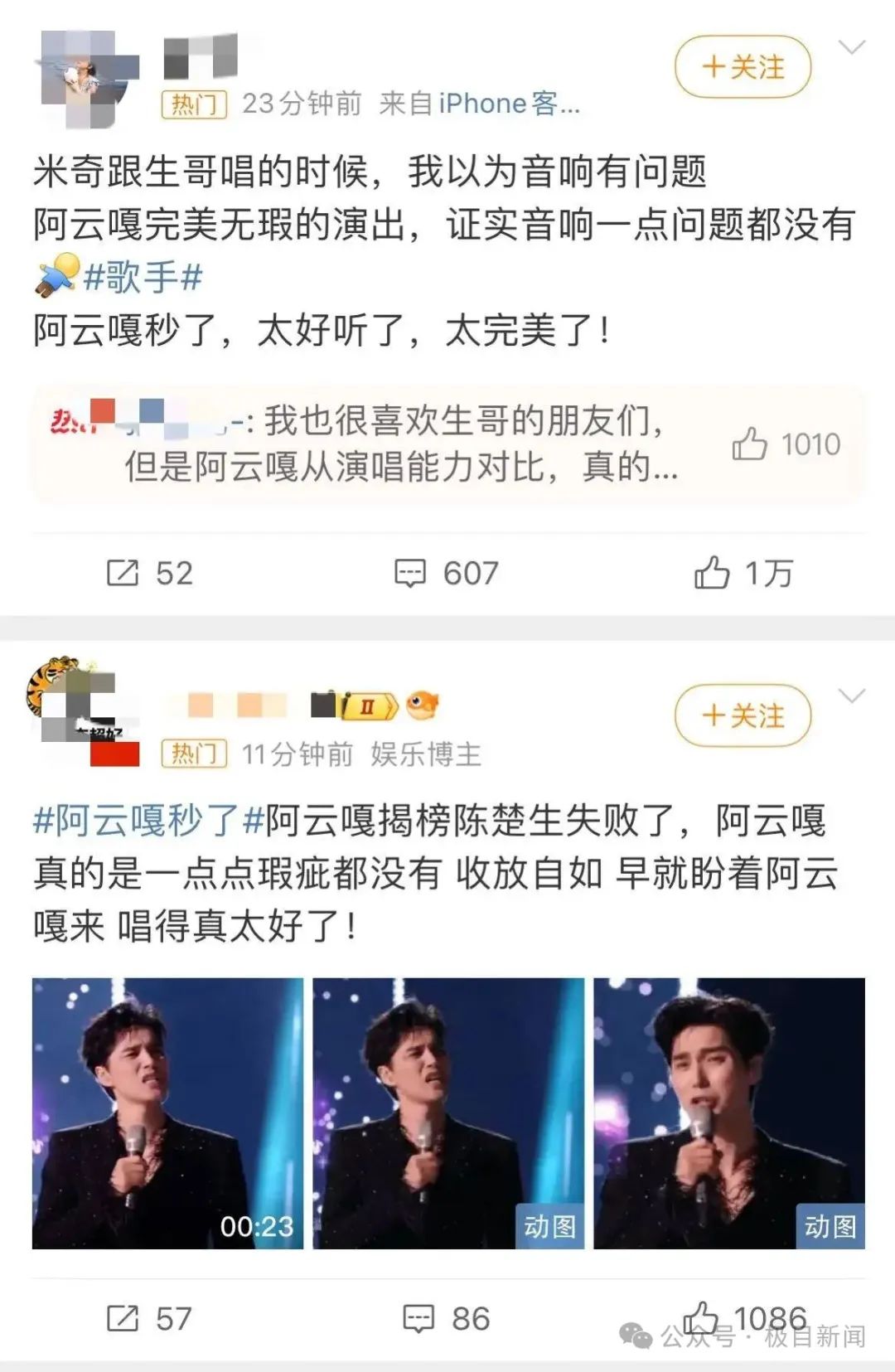 被顶到词条高位的网友认为,陈楚生对《我用什么把你留住》的演绎不如原唱,而且表现比较“平”,甚至高音没声。相形之下,阿云嘎的《余温》音准扎实,声线铿锵有力,更将音乐剧的情感融入其中。