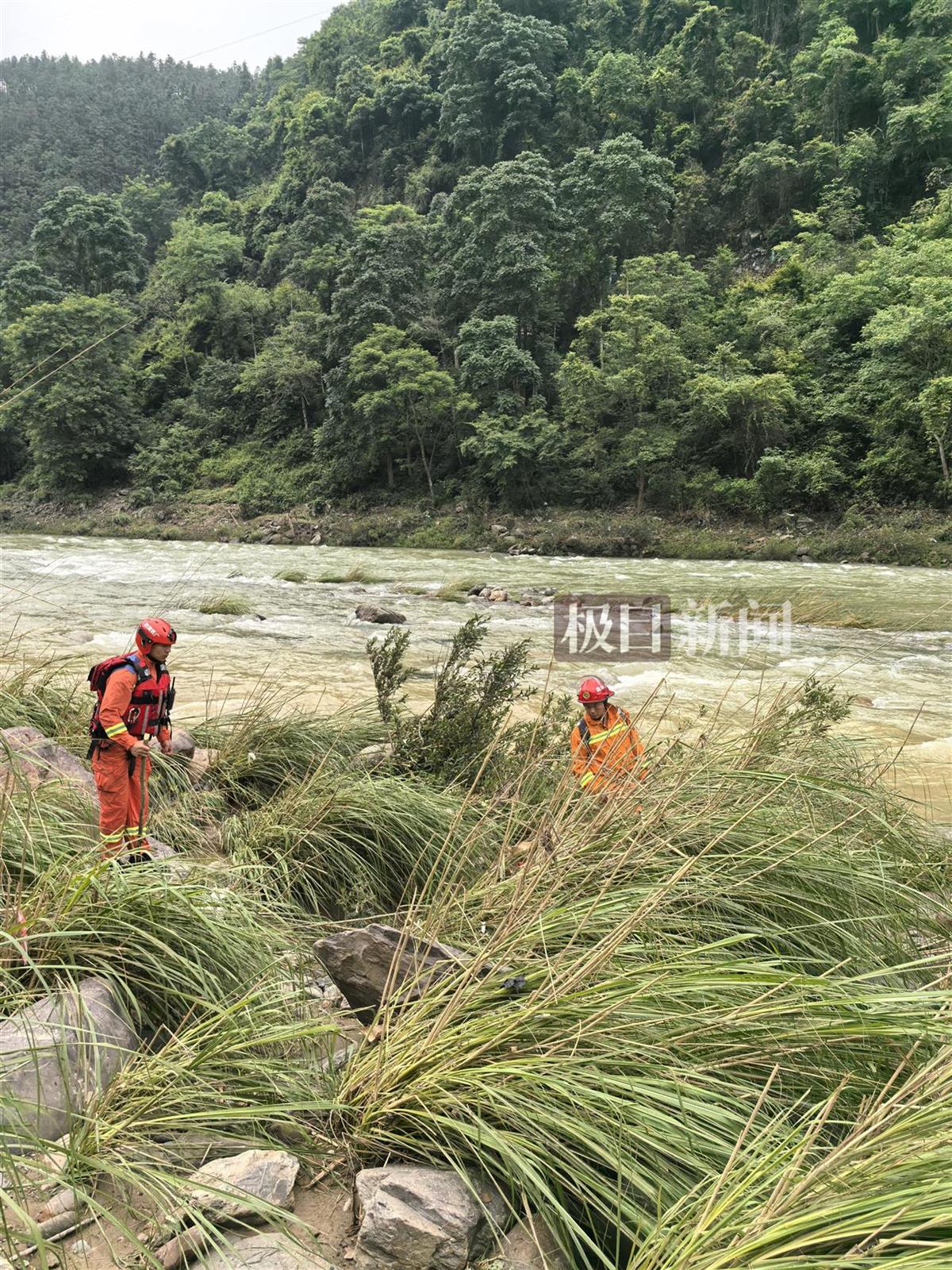 25日上午,龙胜县泗水乡时而飘起小雨。极目新闻记者在浔江边看到,由消防、民警、政府工作人员组成的搜救队伍,一早便分组沿河流搜救另3名失联人员。记者跟随搜救队伍一起沿河边行进,浔江的河水水流湍急,河边杂草丛生,地面石头、泥沙堆积,搜救人员一边砍除杂草一边搜索前行,每一个大石头四周都认真看,每一丛杂草都用木棍挑起来察看。