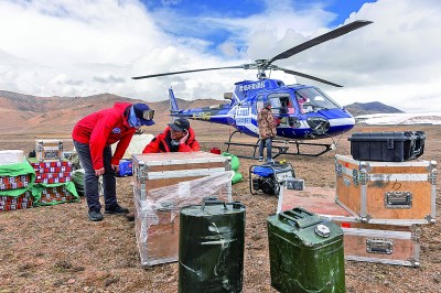 科考团队用直升机将科考物资运往海拔6100米的冰原,以进行冰芯钻取工作。新华社发