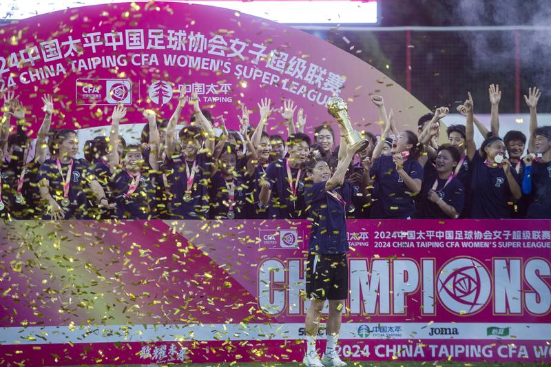 2024中国足协女超联赛,武汉车谷江大队连续第五次获得女超冠军。图为球员姚伟(前)在颁奖仪式上举起奖杯。新华社记者 伍志尊 摄