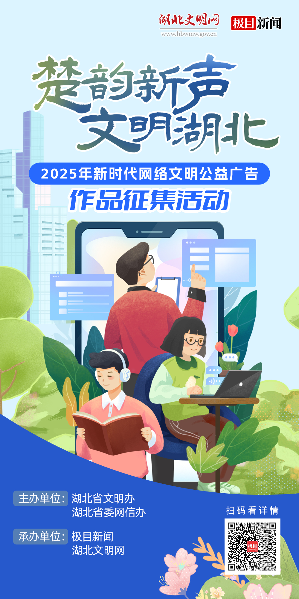 为进一步加强网络文明建设,发挥好公益广告弘扬主流价值、传播文明理念、传承优秀文化、引领时代新风的积极作用,展现湖北特色文化与时代风貌,由湖北省文明办、湖北省委网信办主办,极目新闻、湖北文明网承办的2025年湖北“新时代网络文明公益广告”作品征集活动正式启动。