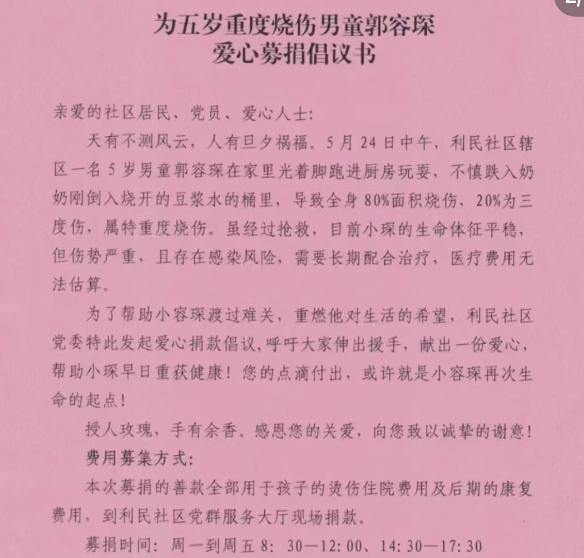 5月28日,利民社区居委会发布爱心募捐倡议书,5月24日5岁男童在家里光脚跑进厨房玩耍,跌入家人刚倒入烧开的豆浆水的桶里,导致全身80%面积烧伤,20%为三度伤,属特重度烧伤。结果抢救,男童目前生命体征平稳,但伤势严重,存在感染风险,需要长期配合治疗,医疗费用无法估算,为此呼吁大家献出安心。