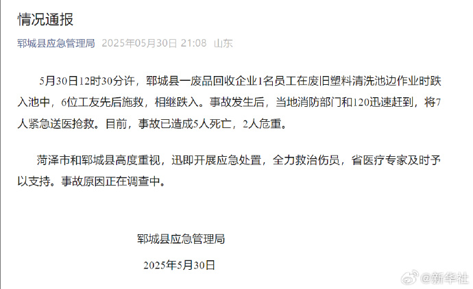 山东郓城县应急管理局发布情况通报:5月30日12时30分许,郓城县一废品回收企业1名员工在废旧塑料清洗池边作业时跌入池中,6位工友先后施救,相继跌入。事故发生后,当地消防部门和120迅速赶到,将7人紧急送医抢救。目前,事故已造成5人死亡,2人危重。菏泽市和郓城县高度重视,迅即开展应急处置,全力救治伤员,省医疗专家及时予以支持。事故原因正在调查中。