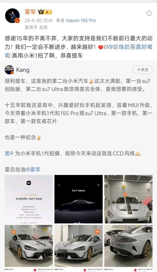 5月30日,有网友在社交平台发布继SU7创始版后,再提SU7 Ultra的图文,并表示“今天带着小米手机1代和15S Pro提SU7 Ultra,第一款手机,第一款车,第一款玄戒芯片,也是一种纪念。”
