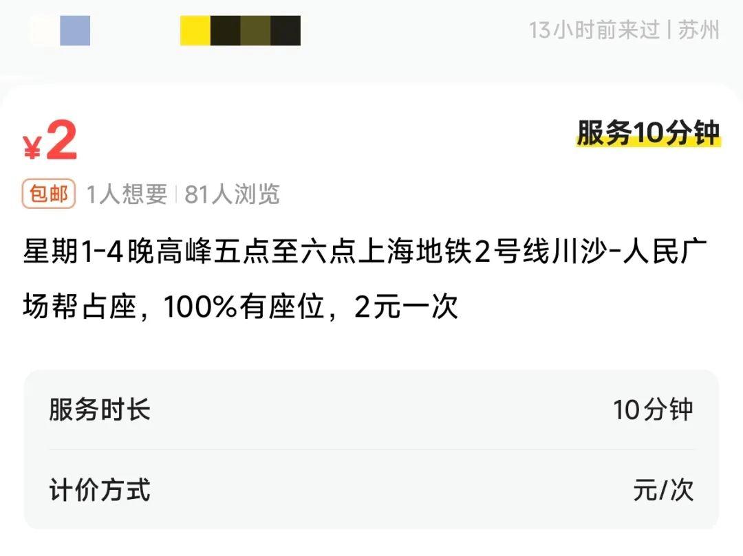 当天13号线人虽不算多,但座位确实都已经坐满。在与卖家的交谈中,记者得知,对方不仅提供单次占座服务,还能包月,按每个工作日早高峰占位来算,一趟2元,一个月50元。卖家表示,自己正是看到年初“地铁卖座”的新闻,觉得这是商机,便也想试试。