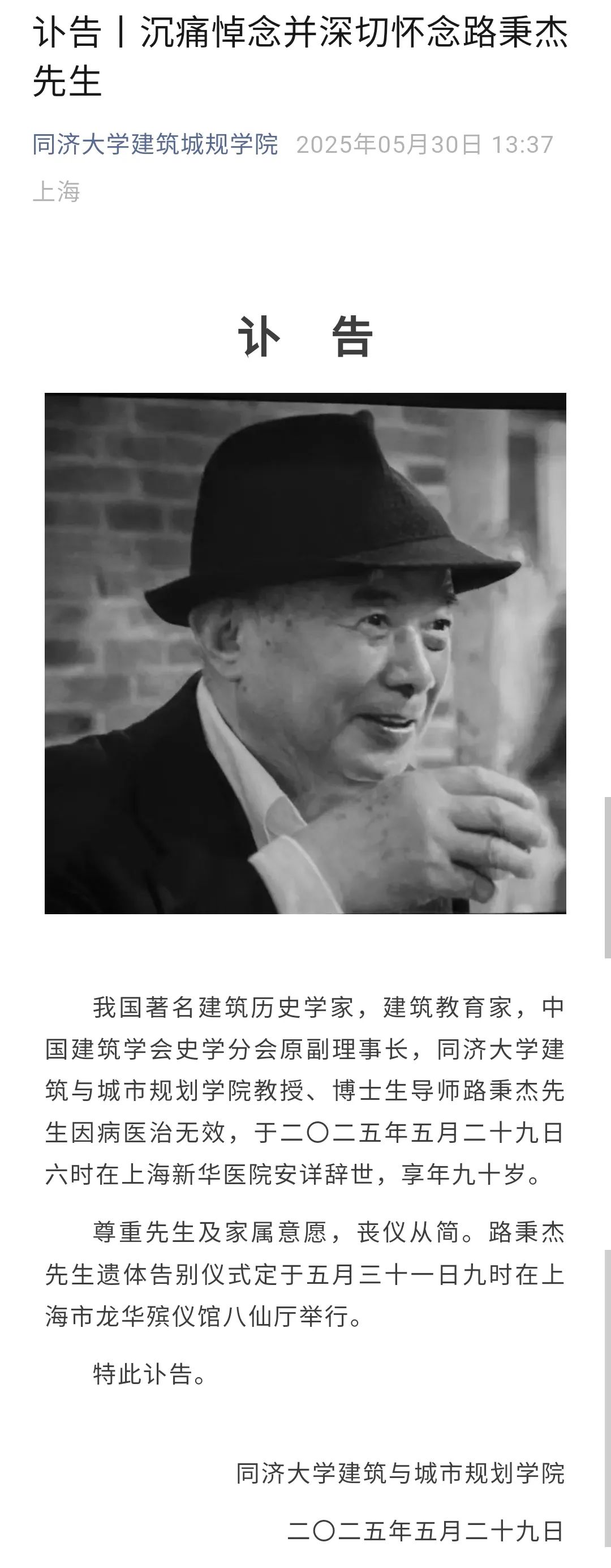 记者从同济大学建筑与城市规划学院获悉,我国著名建筑历史学家,建筑教育家,中国建筑学会史学分会原副理事长,同济大学建筑与城市规划学院教授、博士生导师路秉杰先生因病医治无效,于2025年5月29日6时在上海新华医院安详辞世,享年九十岁。