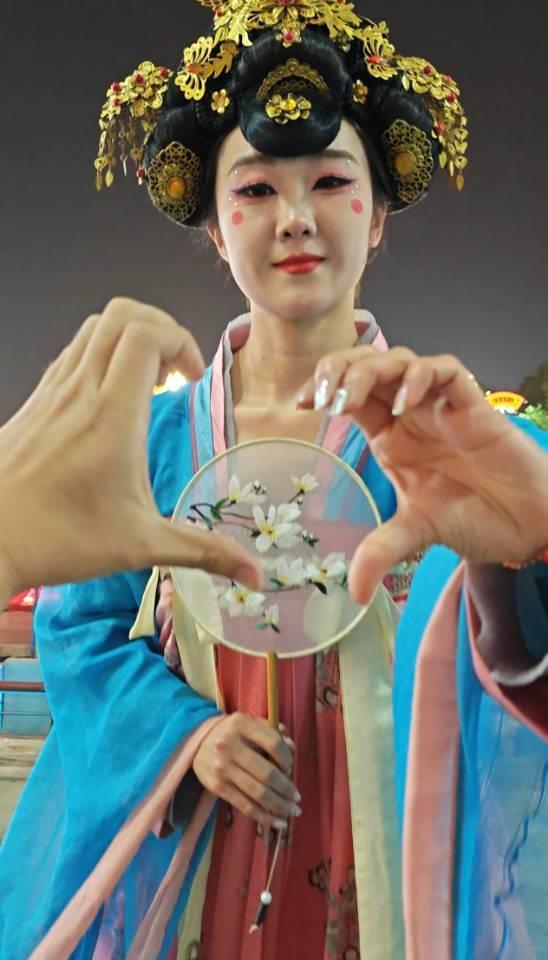 经过艰难抢票,记者获得一张入场券,顺利进入内场。表演当中,两位不倒翁演员与游客们亲切互动,男生手执折扇,女生身着汉服,前后摇晃与游客们互动。和大家一样,记者也用镜头记录了比心的瞬间。