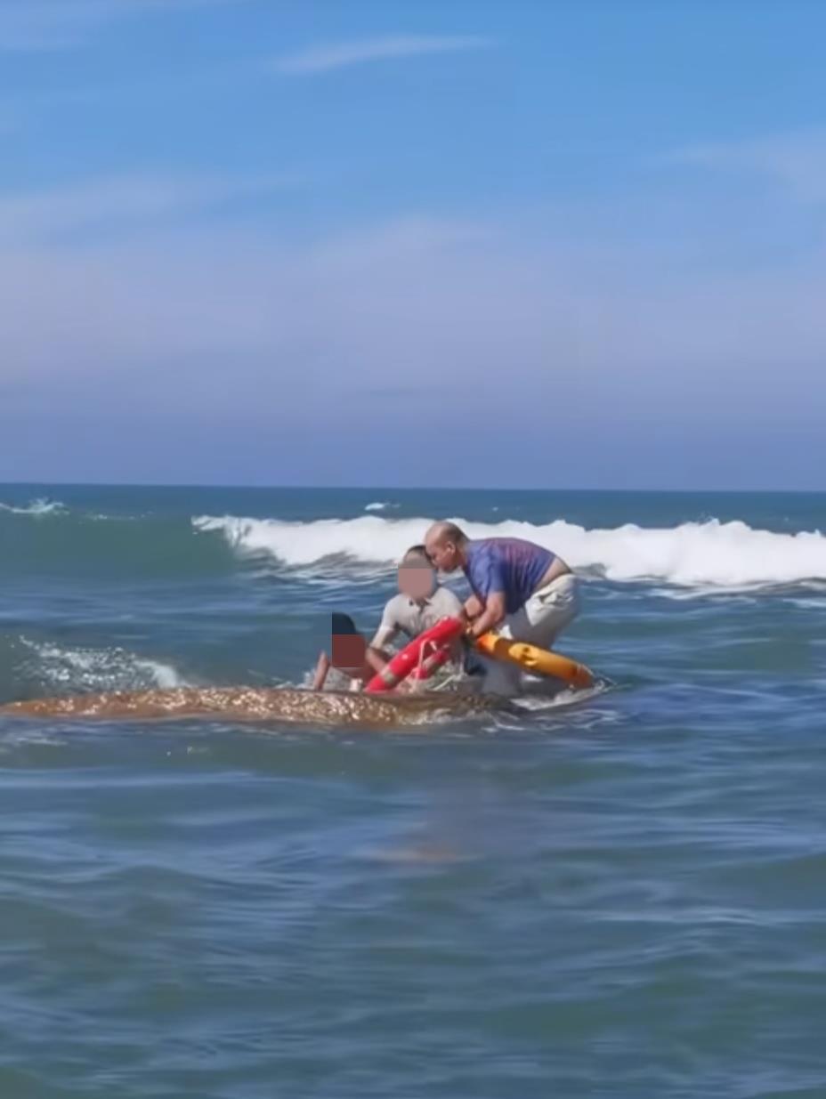 视频显示,海浪中一对父子在挣扎,一名男子带着游泳圈游向两人,最终将游泳圈递到这对父子手中。男子和这对父子最终上到岸边的一块礁石上,暂时安全了。