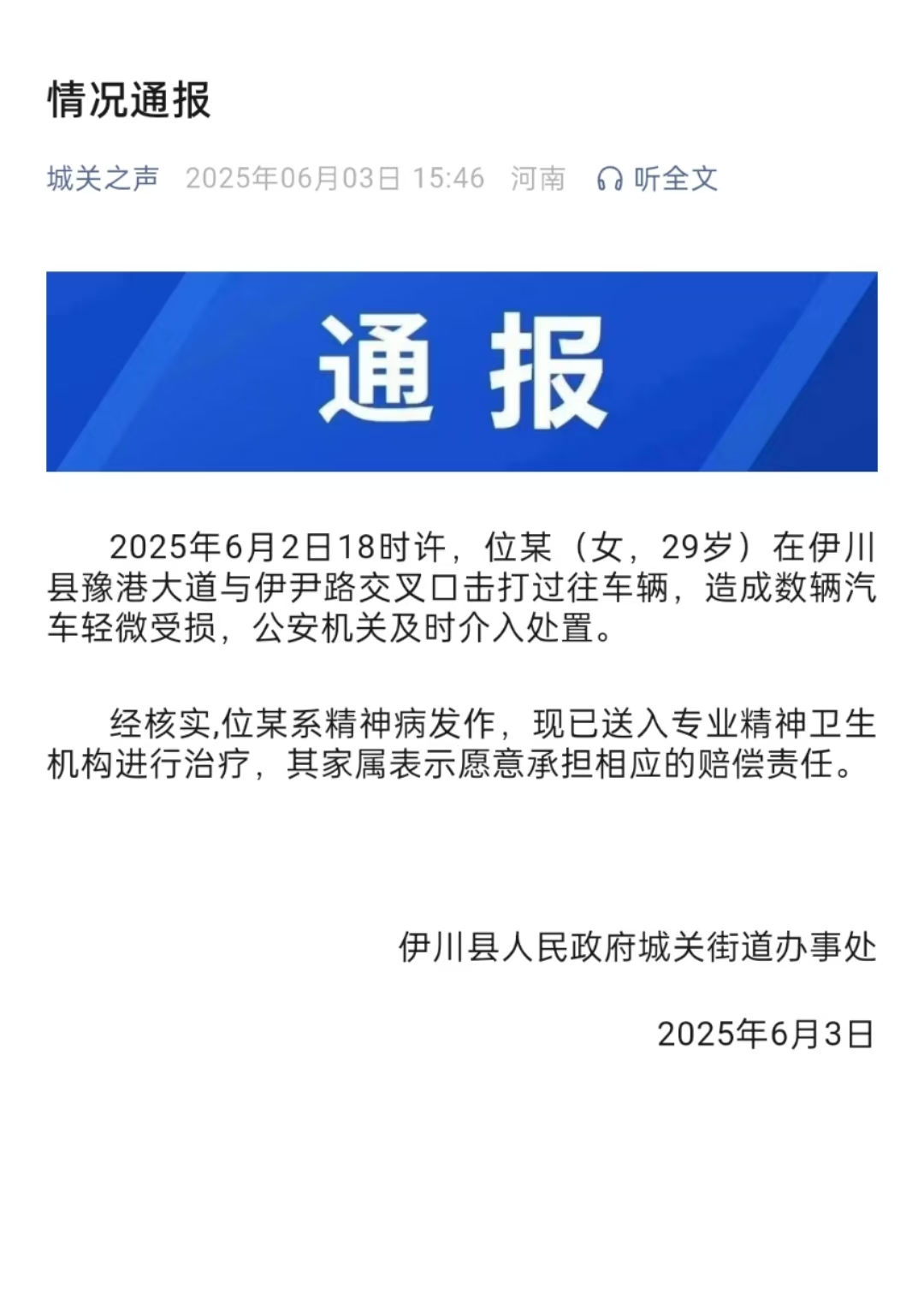 河南省洛阳市伊川县人民政府城关街道办事处6月3日发布情况通报:2025年6月2日18时许,位某(女,29岁)在伊川县豫港大道与伊尹路交叉口击打过往车辆,造成数辆汽车轻微受损,公安机关及时介入处置。经核实,位某系精神病发作,现已送入专业精神卫生机构进行治疗,其家属表示愿意承担相应的赔偿责任