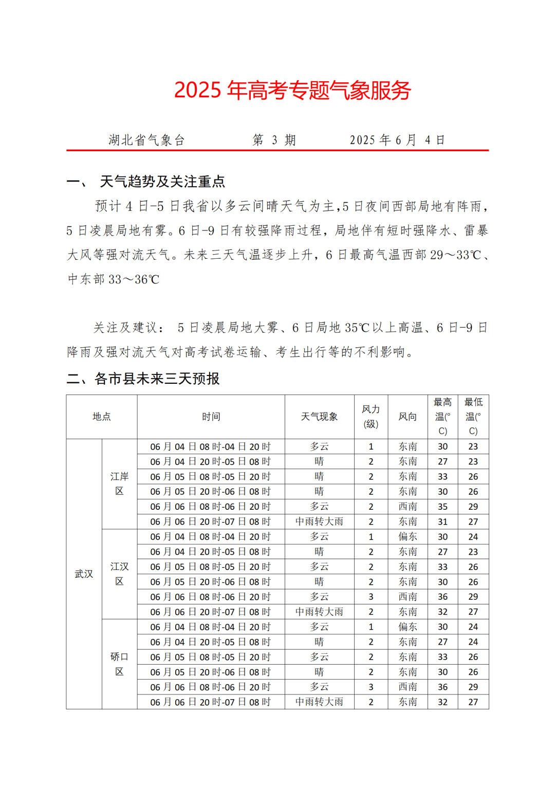 今天上午(4日),湖北气象部门发布了高考专题气象服务。今明两天,湖北地区将以多云间晴天气为主,但未来三天气温将逐步上升,预计6日中东部地区最高气温可达36℃。需要注意的是,6日至9日,即高考期间,湖北将迎来降雨及强对流天气,这将对高考试卷运输和考生出行造成不利影响。