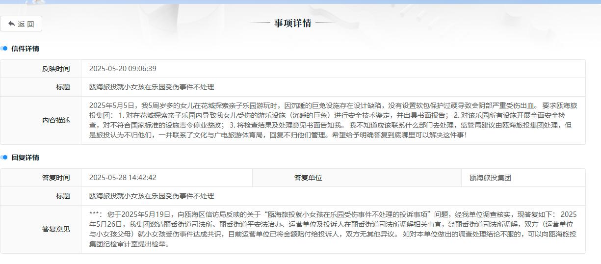 5月28日,该乐园管理方瓯海旅投集团对该事项进行答复称,5月26日,集团邀请街道司法所、街道平安法治办、运营单位及投诉人在街道司法所调解相关事宜,经街道司法所调解,双方(运营单位与小女孩父母)就小女孩受伤事件达成共识,目前运营单位已将金额赔付给投诉人,双方无其他异议。