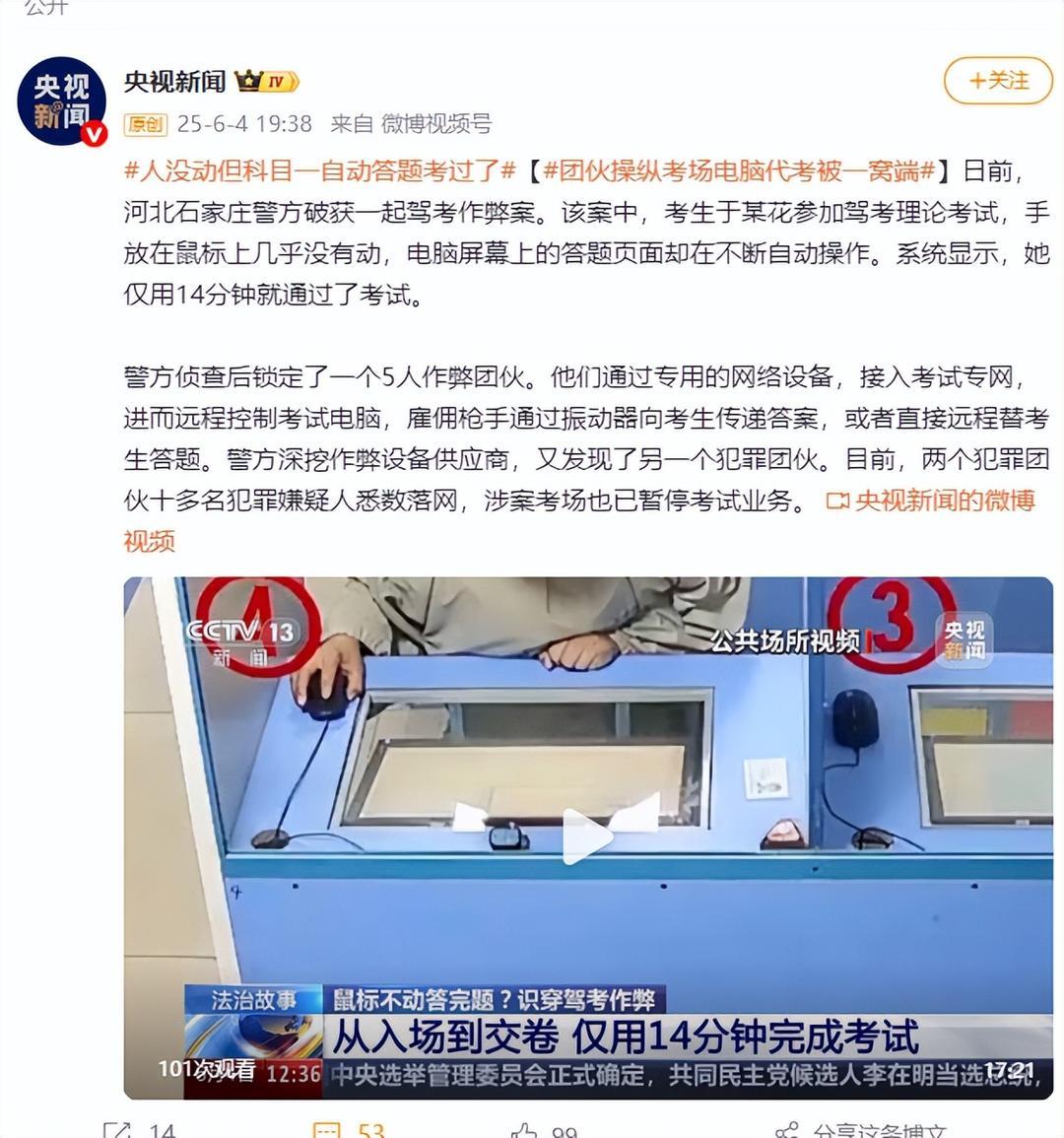 日前,河北石家庄警方破获一起驾考作弊案。该案中,考生于某花参加驾考理论考试,手放在鼠标上几乎没有动,电脑屏幕上的答题页面却在不断自动操作。系统显示,她仅用14分钟就通过了考试。