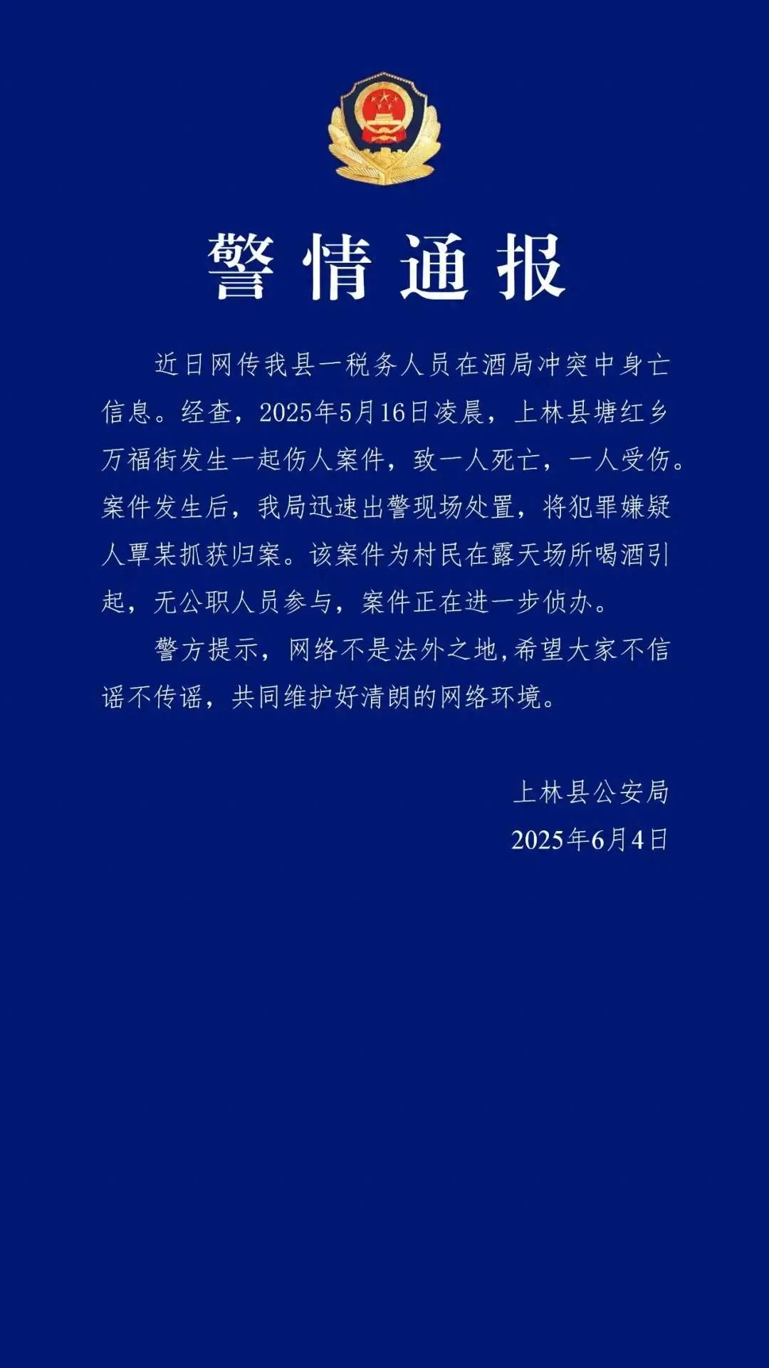 近日,网传广西南宁上林县一税务人员在酒局冲突中身亡。6月4日晚,上林县公安局发布警情通报: